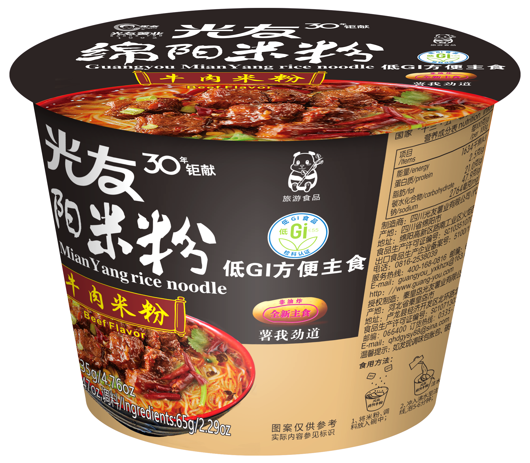 人體臨床試驗確認光友綿陽米粉牛肉米粉為低GI健康食品:由中國食品發(fā)酵工業(yè)研究院對光友綿陽米粉牛肉米粉作臨床試驗,取得血糖生成指數(shù)評價報告。光友綿陽米粉牛肉米粉GI值為51,屬于低GI食物(低GI≤55)。臨床試驗結果表明,在各項降低食物血糖應答機制的作用下,食用光友綿陽米粉牛肉米粉后,人體血糖值在 30 min 時緩慢升高至峰值,此時食用光友綿陽米粉牛肉米粉的血糖值僅為葡萄糖標準物的89%。隨后即開始下降,且食用光友綿陽米粉牛肉米粉的血糖水平下降較緩慢。受試食物餐后2h血糖曲線對比葡萄糖標準物屬于“緩升緩降”的狀態(tài)。因此,光友綿陽米粉牛肉米粉在進食后有助于維持餐后血糖的穩(wěn)定狀態(tài),從而可以避免因血糖的劇烈波動引起的一系列不良的代謝反應。光友低GI健康薯類方便主食歷經(jīng)32年研究,并通過低GI認證,為預防和控制逐年增多的高血脂、高血壓、高血糖等慢性病人群做出了重大貢獻。