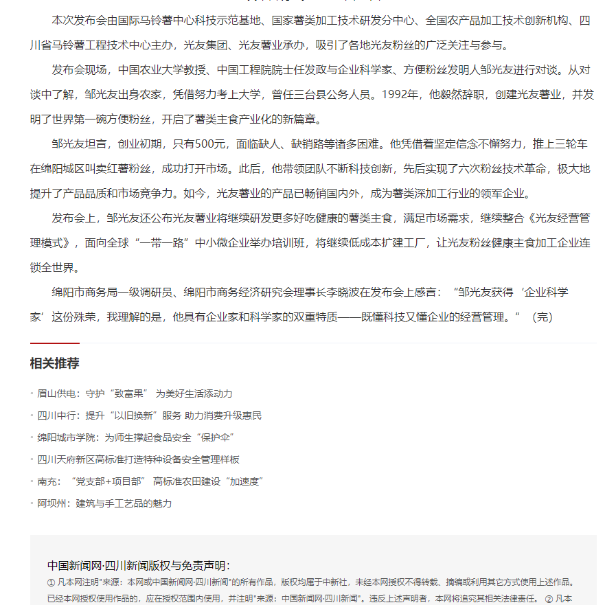 轉(zhuǎn)載中國(guó)新聞網(wǎng)·四川新聞——方便粉絲發(fā)明人鄒光友:科技創(chuàng)業(yè)點(diǎn)亮新“薯”光